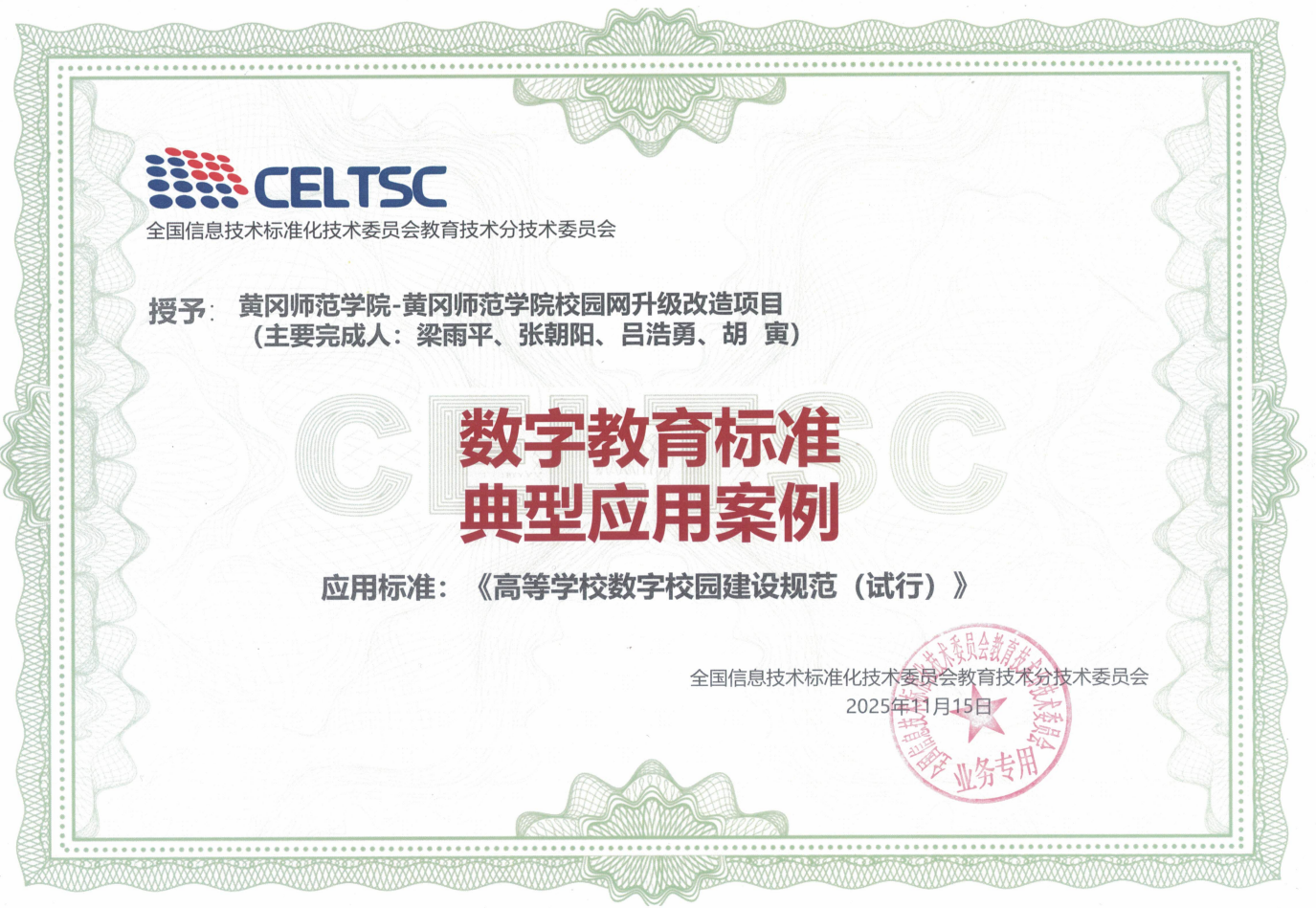 2025年11月16日,国信息技术标准化技术委员会教育技术分技术委员会(暨教育部教育信息化技术标准委员会(CELTSC),以下简称“标委会”)会议在三亚召开。我校申报的《黄冈师范学院校园网升级改造项目》成功入选,荣获“2025年CELTSC标准应用典型案例”—“数字教育标准应用案例”,成为高校数智化建设的典型实践。