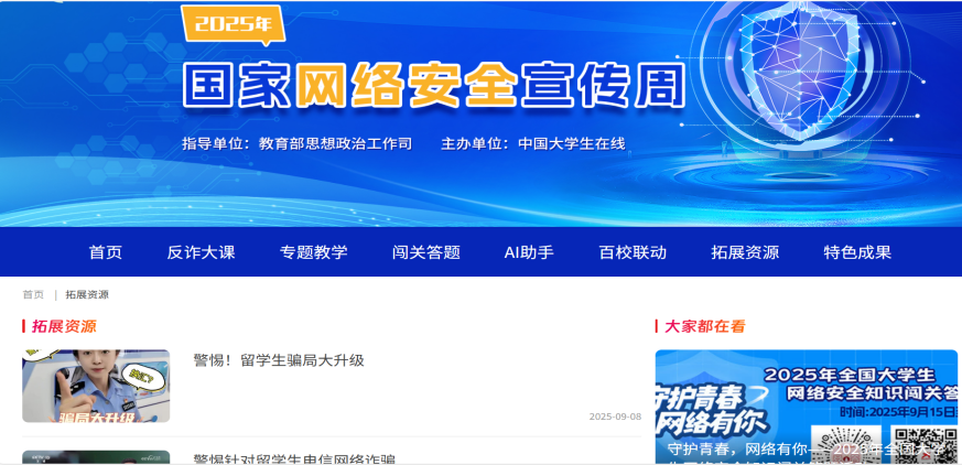 (五)开展2025年“网络安全百校行”。鼓励全校师生通过中国大学生在线官网“2025年国家网络安全宣传周”专题进入学习资源库,获取网络认知、网络安全、反间防谍等精品课程资源。