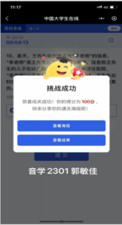 (二)“全国大学生网络安全知识闯关答活动。全员参与,巩固知识。各教学学院组织全院学生参与由中国大学生在线平台主办的网络安全知识闯关答题。此次活动要求全体同学在规定时限内完成,并保留成绩截图。答题内容涵盖了网络安全法律法规、个人信息保护、网络支付安全、防范网络诈骗、抵制网络谣言等多个方面。同学们积极参与,通过答题不仅检验了观看“反诈第一课”的学习成果,更系统地学习和巩固了网络安全知识,在闯关过程中激发了学习兴趣,实现了寓教于乐。保留截图的要求也确保了活动的可追溯性和参与度的真实性。