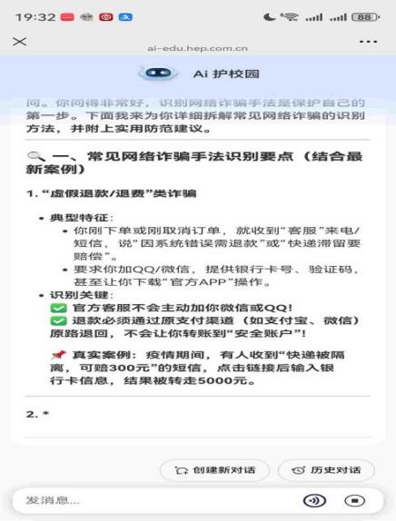 (四)“AI护校园”智能工具推广与实践。我校信息中心老师开展“AI护校园”智能体使用培训,通过线上直播+线下实操,指导师生掌握“风险链接检测”“诈骗信息识别”“个人信息保护查询”等功能操作,帮助学生利用智能工具快速排查网络安全隐患。组织成立“网络安全志愿排查小组”,在教职工群、班级群、宿舍群推广“AI护校园”工具,协助师生检测可疑链接、解答诈骗咨询。